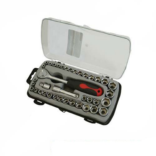 Douilles, carré 1/4": AF 5/32", 3/16", 7/32", 1/4", 9/32", 5/16", 11/32", 3/8", 13/32", 7/16", 15/32", 1/2" et 17/32". Métriques: 4, 4,5, 5, 5,5, 6, 6,5, 7, 8, 9, 10, 11, 12 et 13 mm. Torx: 1/4", 5/16" et 3/8". Douilles, carré 3/8" : AF 9/16" et 5/8". Métriques : 14, 15, 16 et 17 mm. Adaptateur 1/4" - 3/8", Rallonge 3/8". Molette de serrage manuel. Poignée cliquet caoutchoutée carré 3/8". Coffret de rangement