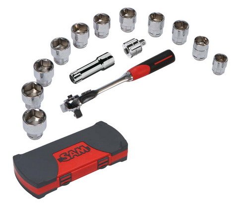 Materiel professionnel garanti a vie. Coffret douilles et accessoires 1/2" avec cliquet et douilles traversantes. - 1 Cliquet pour douille débouchée SHS / ref SAM: S-156B + 1 Rallonge débouchée pour cliquet S-156B et douille SHS / ref SAM: S-202 + 1 Adaptateur cliquet push pour douille standard 1/2" / ref SAM: S-102 + 11 Douille débouchée en mm / 21 22 23 24 25 26 27 28 29 30 32 mm / ref SAM: SHS-10