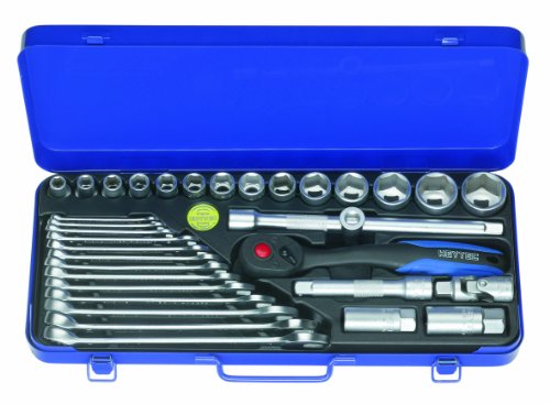 - Contenu : cliquet réversible avec revêtement plastique, rallonges 125 + 205 mm, cardan universel 70 mm, douilles 10 mm à 32 mm, douilles pour bougies 16 + 20,8 mm, clés mixtes 6 à 22 mm